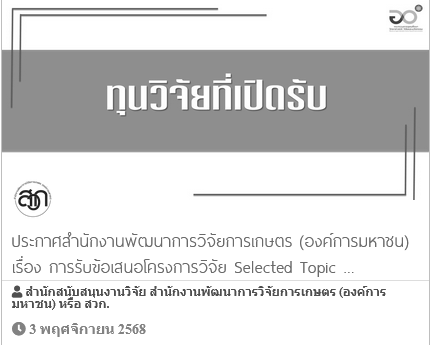 ประกาศสำนักงานพัฒนาการวิจัยการเกษตร (องค์การมหาชน)เรื่อง การรับข้อเสนอโครงการวิจัย Selected Topic “แผนงานน้ำมั่นคง ไม่ท่วม ไม่แล้ง ใน 10 จังหวัด” ประจำปีงบประมาณ 2569
