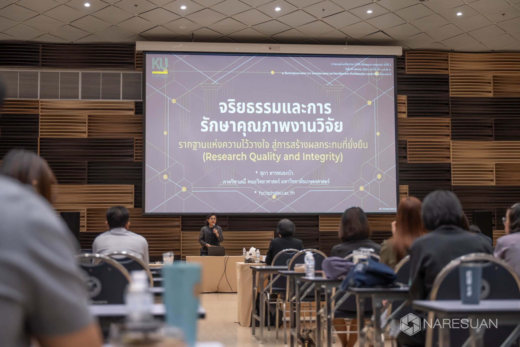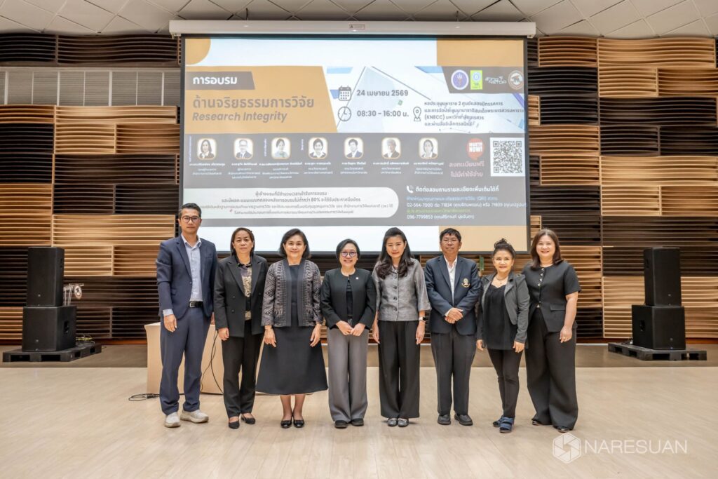 เมื่อวันที่ 24 เมษายน 2569 ศาสตราจารย์ ดร.เภสัชกรหญิงกรกนก อิงคนินันท์ รองอธิการบดีฝ่ายพัฒนางานวิจัยและนวัตกรรม มหาวิทยาลัยนเรศวร กล่าวต้อนรับและแจ้งวัตถุประสงค์การอบรมด้านจริยธรรมการวิจัย (Research Integrity) ครั้งที่ 2 โดยมี ศาสตราจารย์ ดร.ชูกิจ ลิมปิจำนงค์ ผู้อำนวยการสำนักงานพัฒนาวิทยาศาสตร์และเทคโนโลยีแห่งชาติ (สวทช.) และ นางสาวศิรินทร์พร เดียวตระกูล รองผู้อำนวยการสำนักงานการวิจัยแห่งชาติ (วช.) เป็นผู้กล่าวเปิดร่วม ทั้งนี้มีผู้เข้าร่วมอบรมทั้งรูปแบบออนไลน์ และออนไซต์ กว่า 3,000 คน ณ หอประชุมมหาราช 2 ศูนย์แสดงนิทรรศการและการจัดประชุมนานาชาติสมเด็จพระนเรศวรมหาราช (KNECC) มหาวิทยาลัยนเรศวร